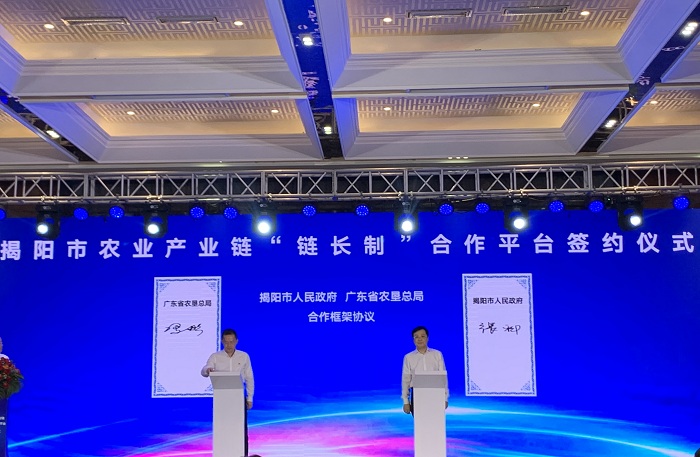 5月27日,揭陽市人民政府舉行揭陽市農(nóng)業(yè)產(chǎn)業(yè)鏈“鏈長(zhǎng)制”合作平臺(tái)簽約儀式。省農(nóng)墾集團(tuán)公司(省農(nóng)墾總局)黨委副書記、董事、總經(jīng)理(副局長(zhǎng))馮彤出席活動(dòng)。